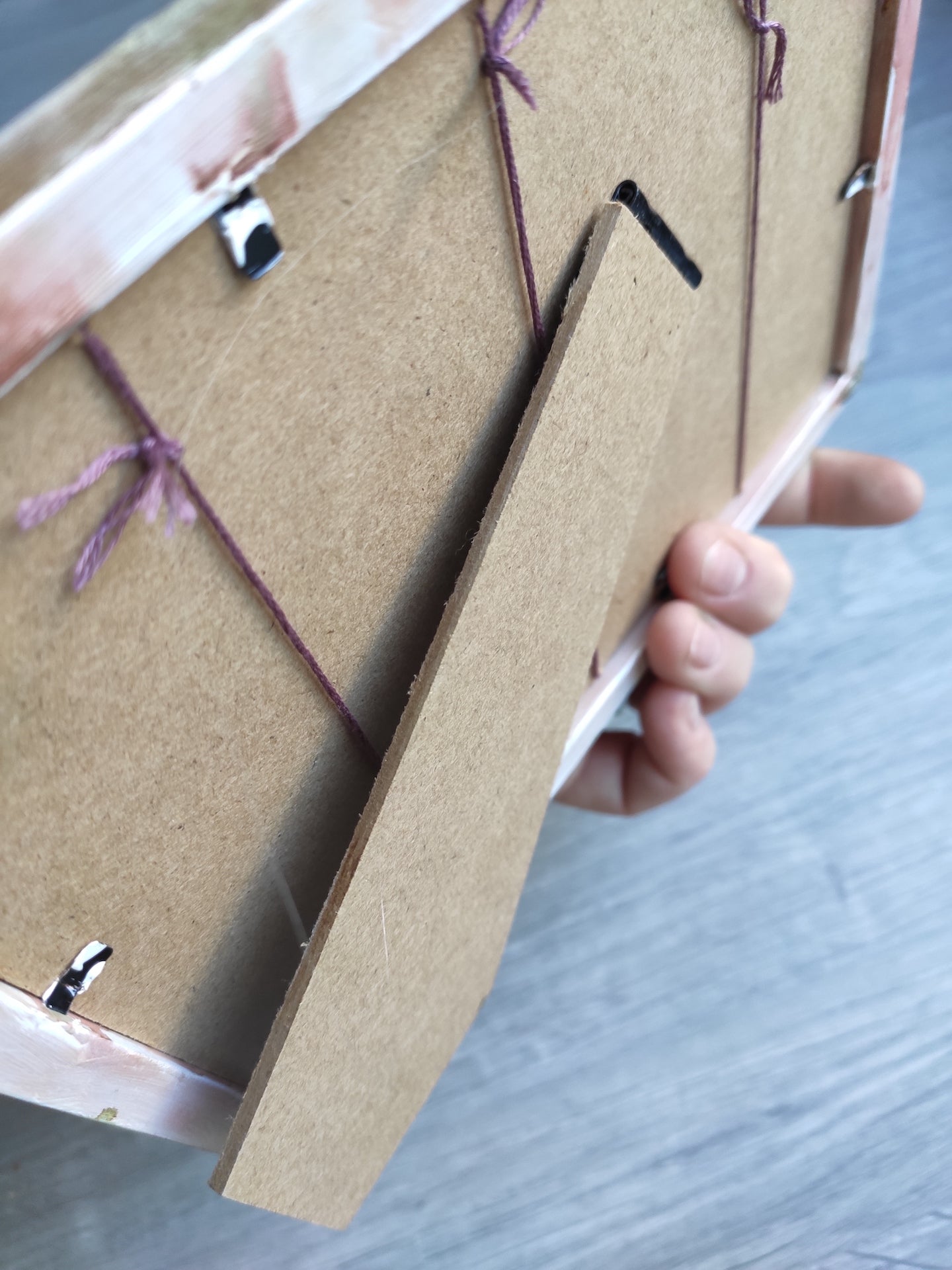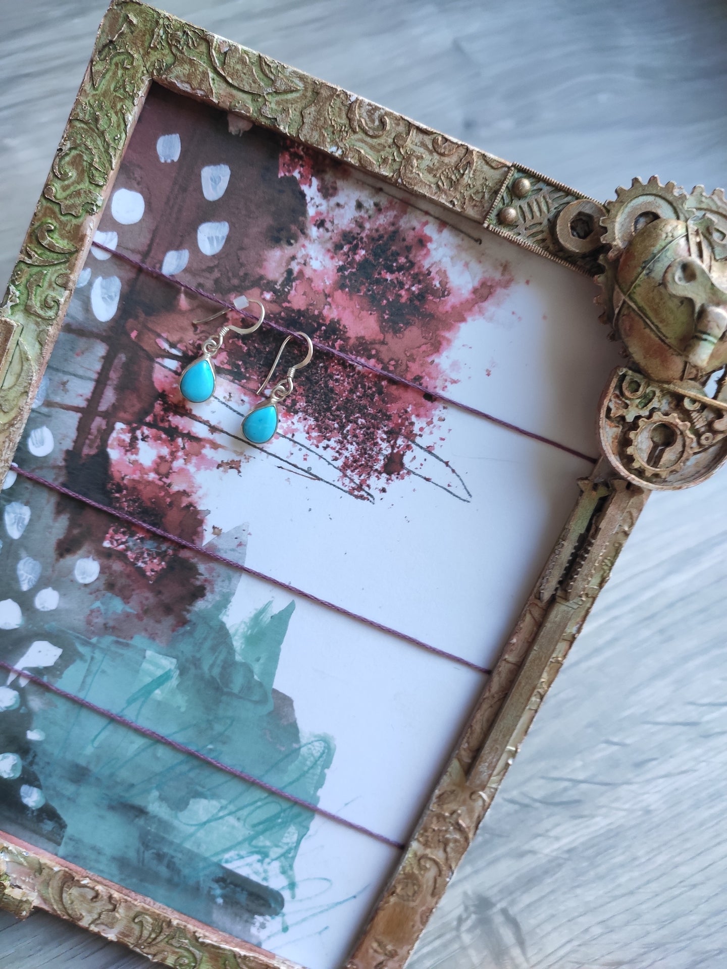 This is an altered frame which, from personal experience, is a great idea for keeping your earrings and hair clips in one place. Or you can remove the strings for holding hair clips and use it for sth totatlly different :)