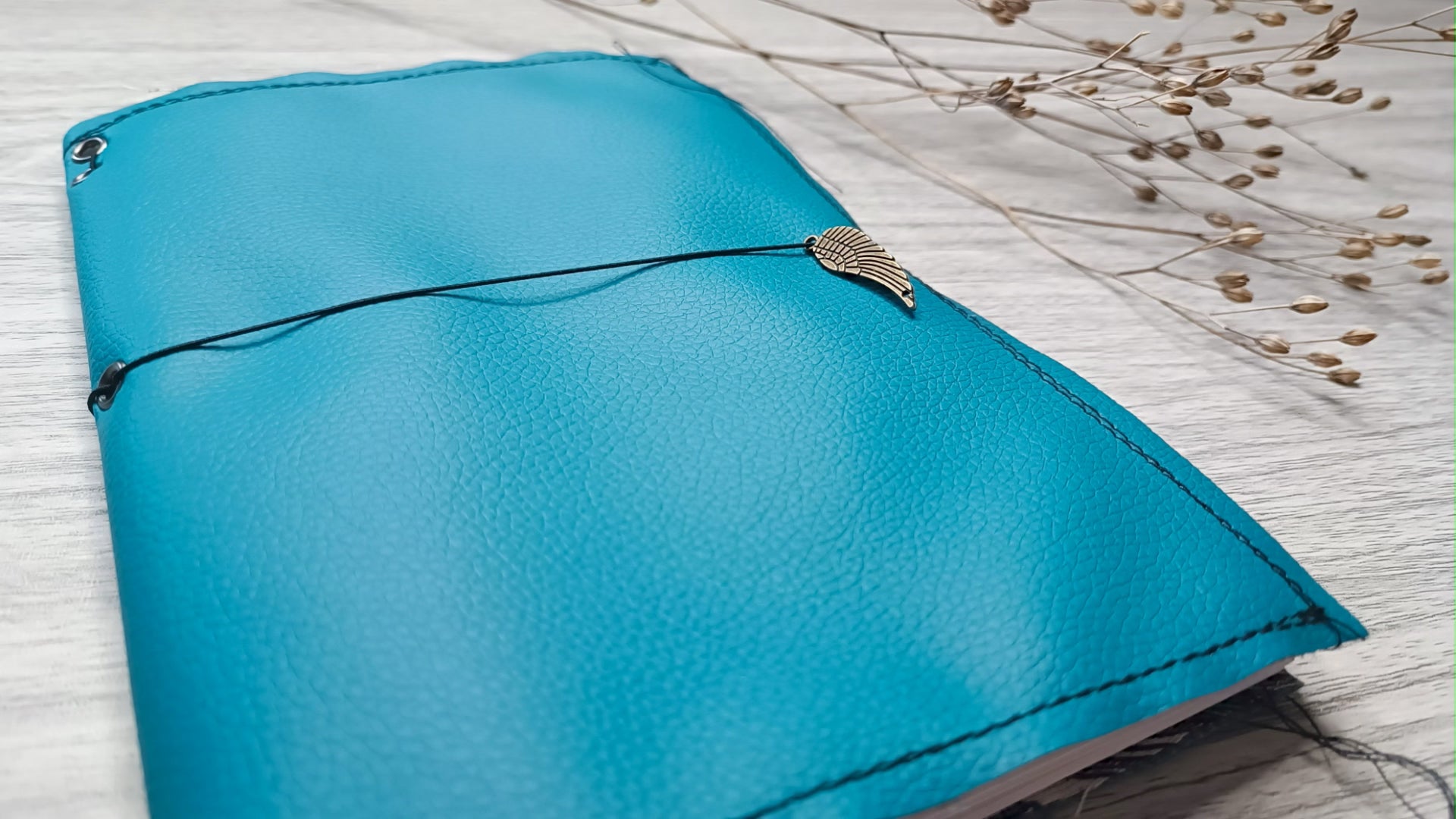 Butterfly art journal, entirely handmade, with leather-like cover and watercolor paper (300g, cold press) inside (one side grainy, other smooth). I come with elastic band and a charm.