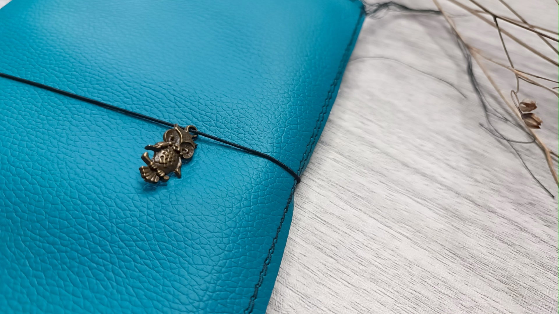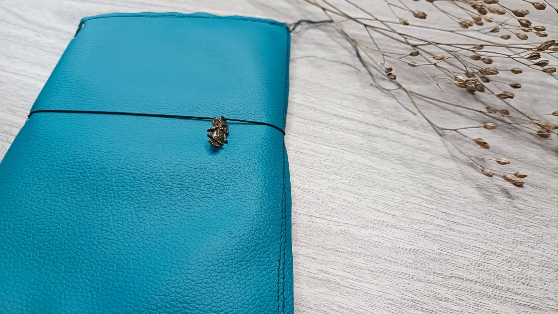Butterfly art journal, entirely handmade, with leather-like cover and watercolor paper (300g, cold press) inside (one side grainy, other smooth). I come with elastic band and a charm.