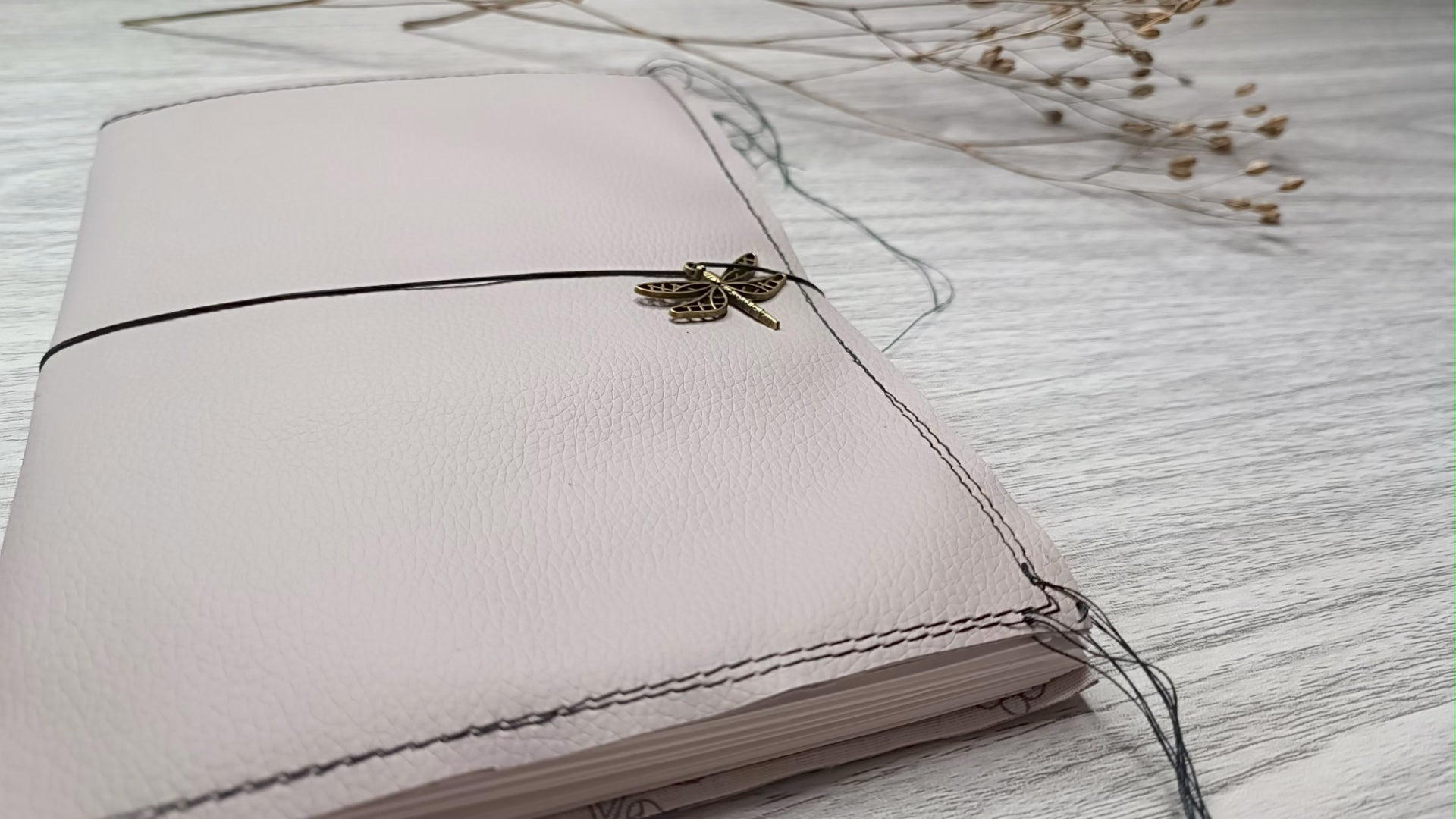 Butterfly art journal, entirely handmade, with leather-like cover and watercolor paper (300g, cold press) inside (one side grainy, other smooth). I come with elastic band and a charm.