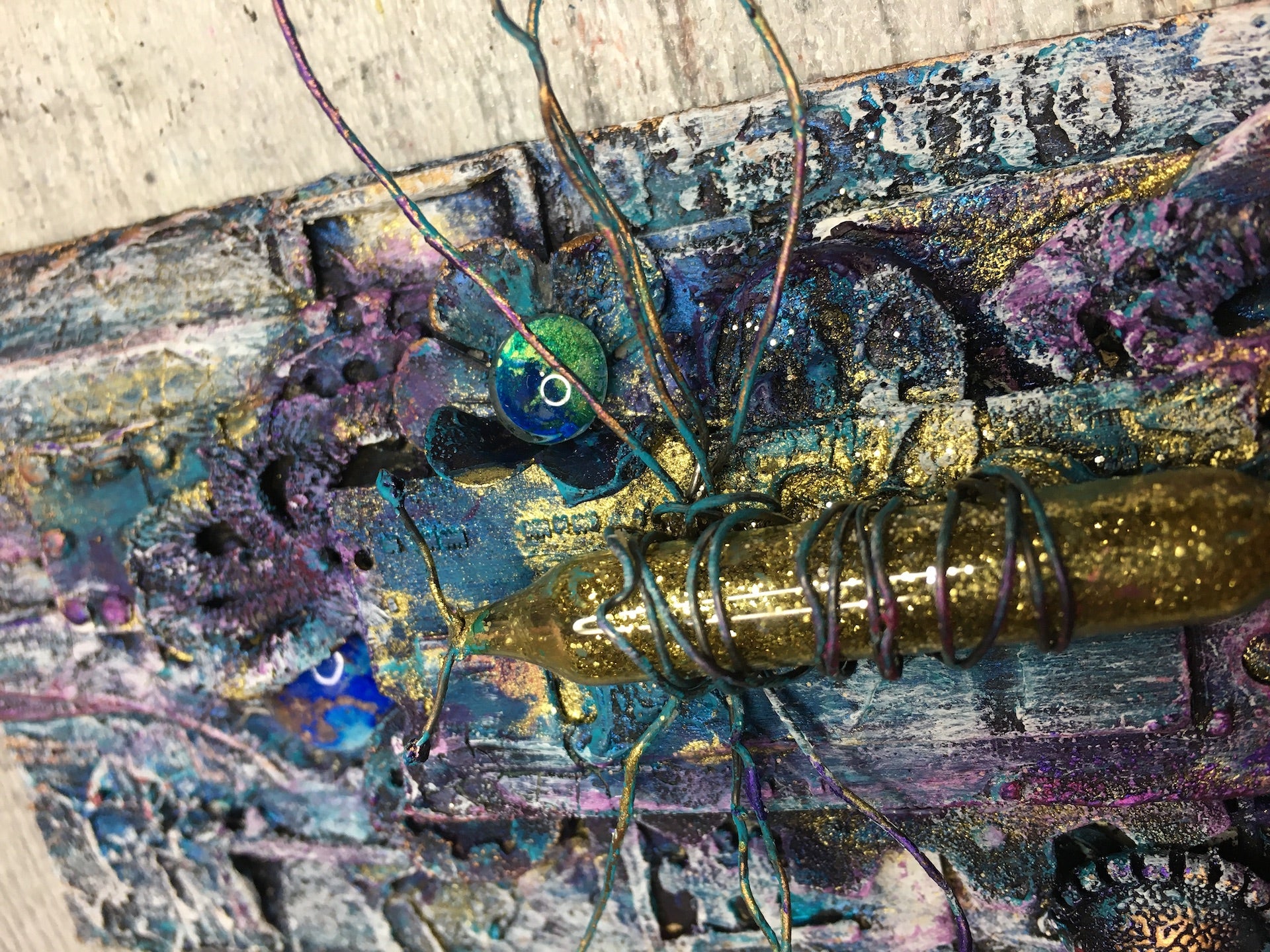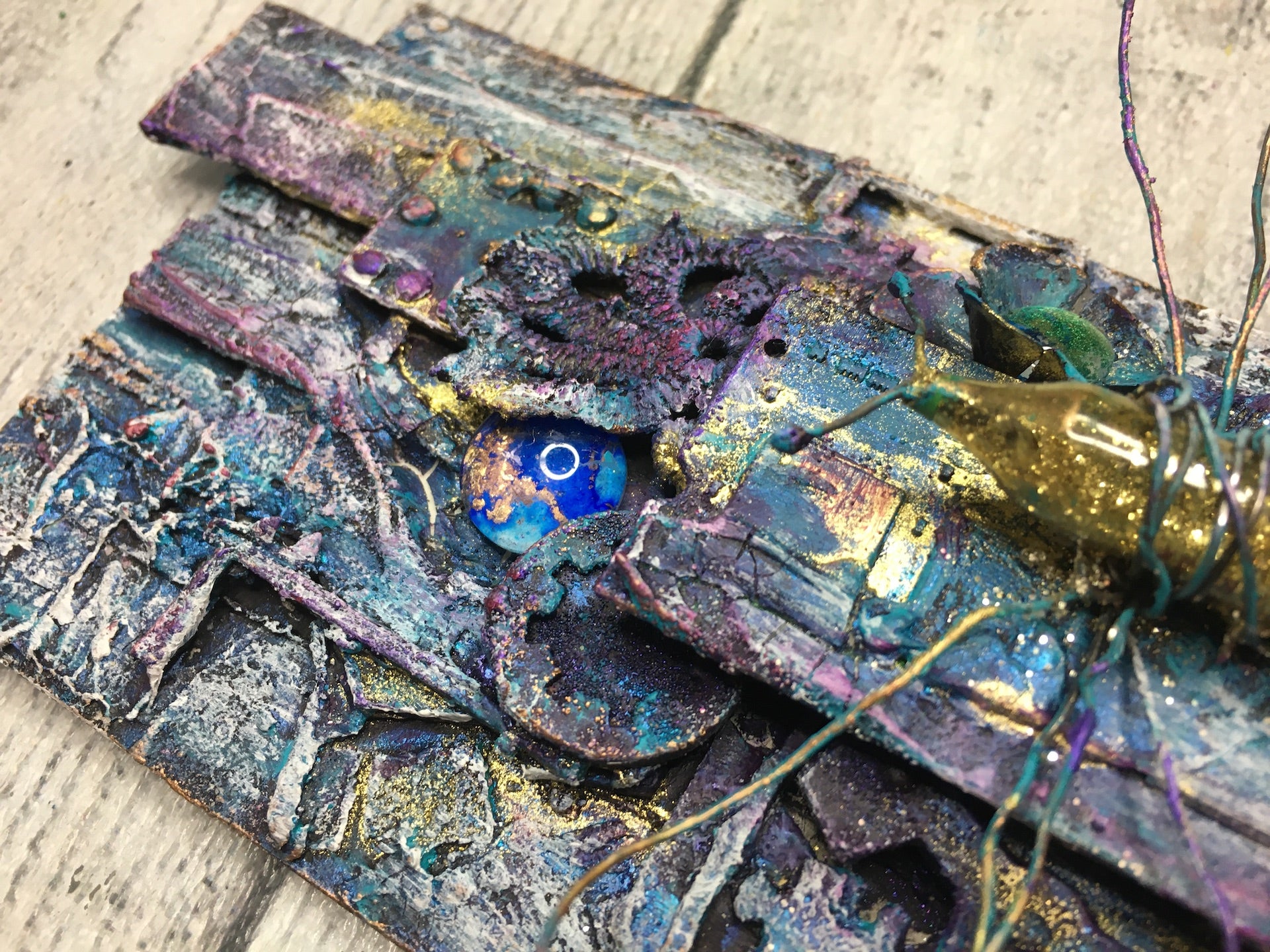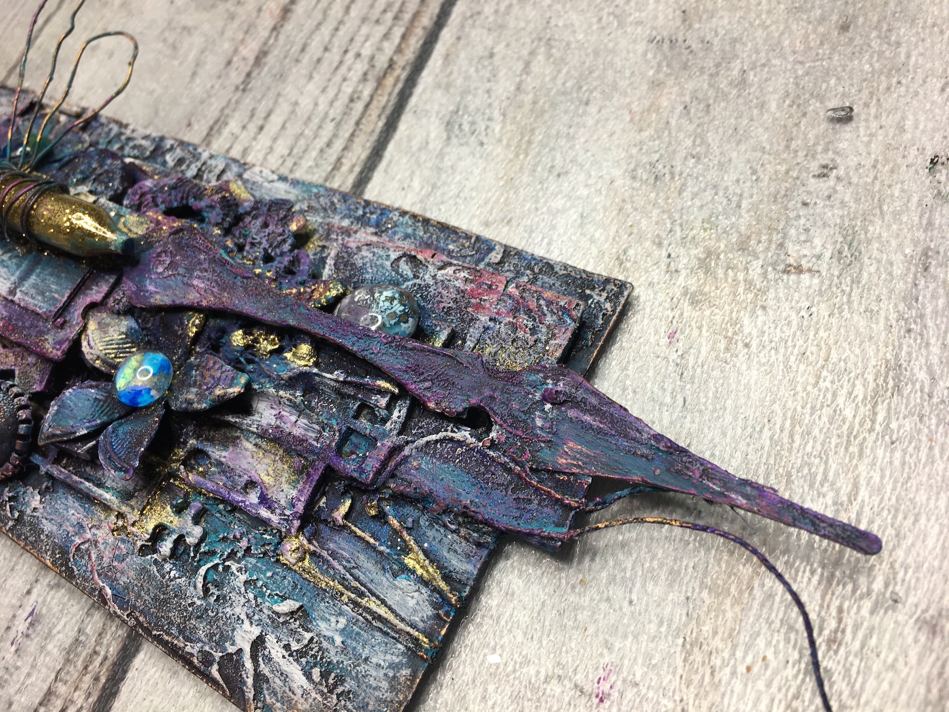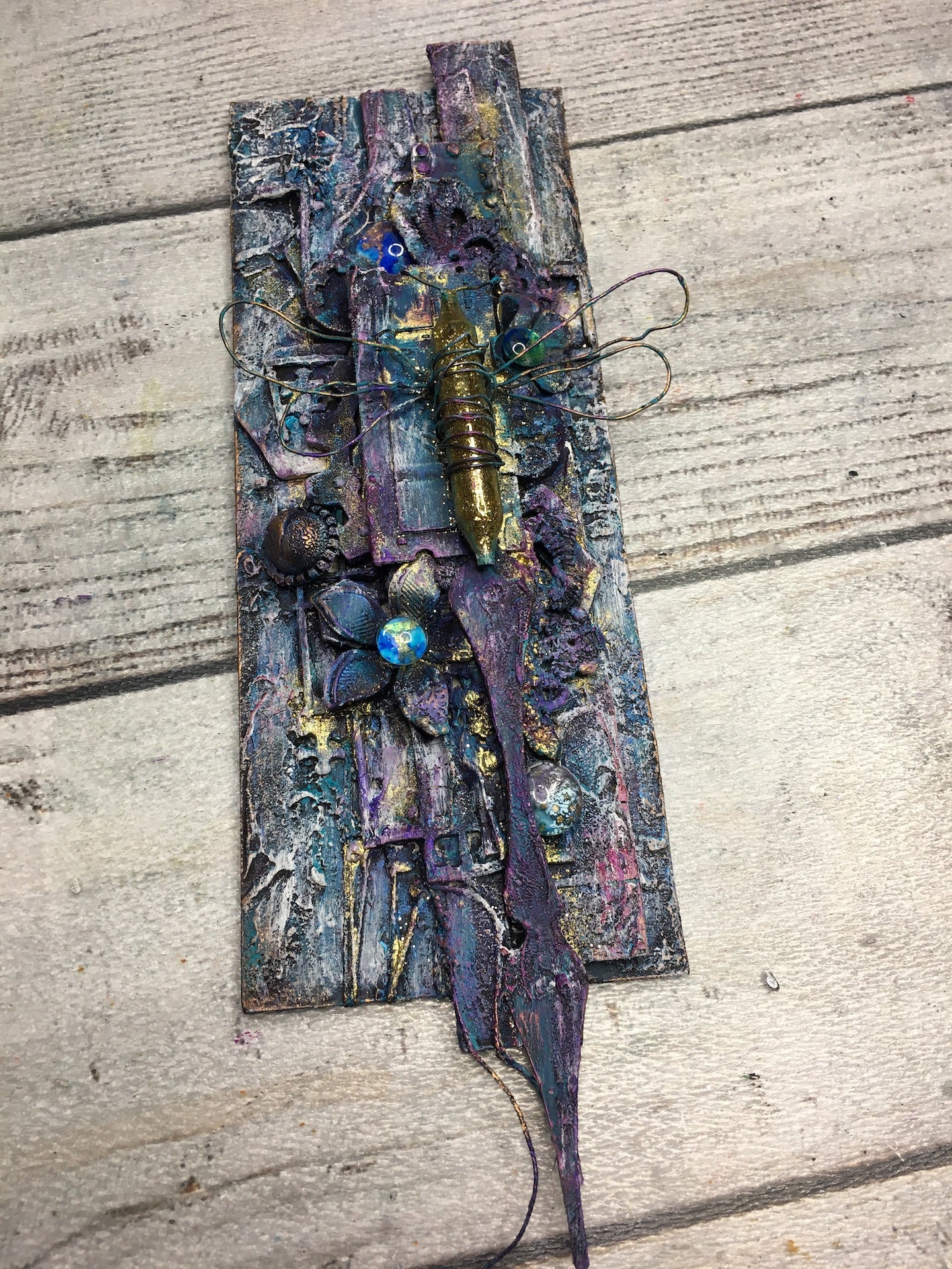 Long tag with steampunk butterfly as a focal point, very layered in bright colors- mostly purples and blues;
