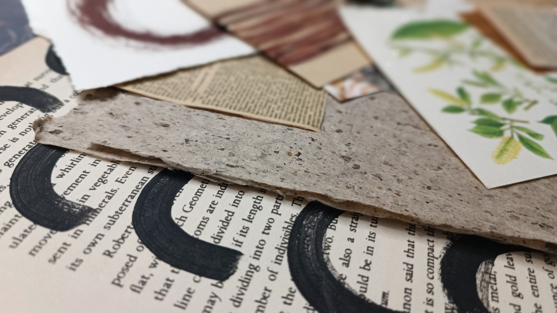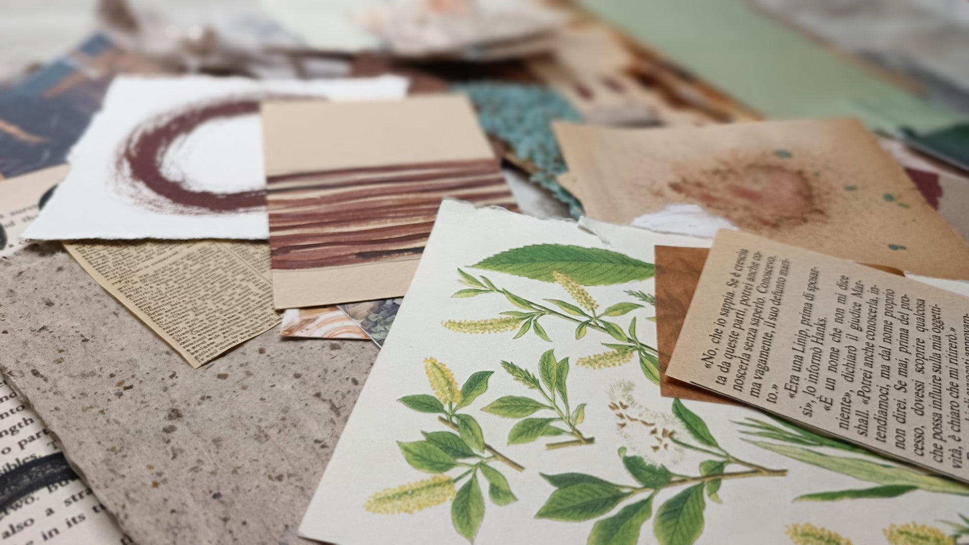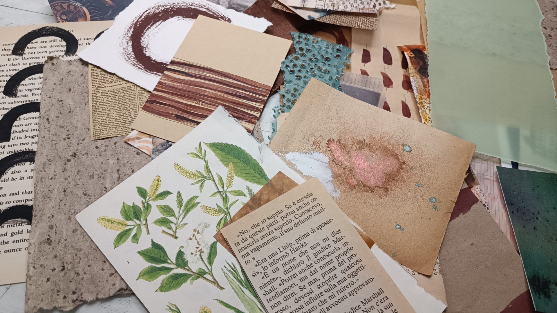 Curated collage bundle with around 40 different papers: 2 enveloppes with handmade mark making, 2 fabric pieces, vellum textured paper (yes, the one with burnt holes!), piece of my handmade washi tape, old book pages, cicada wings and mulberry paper, few handmade backgrounds of different sizes, one watercolor on the paper, and many, many more. I also add small surprise not seen on the video or photos, which includes a piece of blank washi tape ready to be personalised by you (the glossy side is covered with water-activated glue)