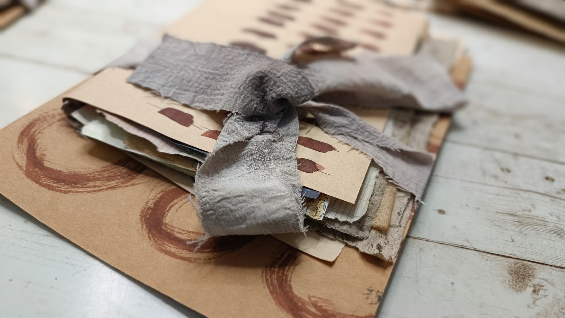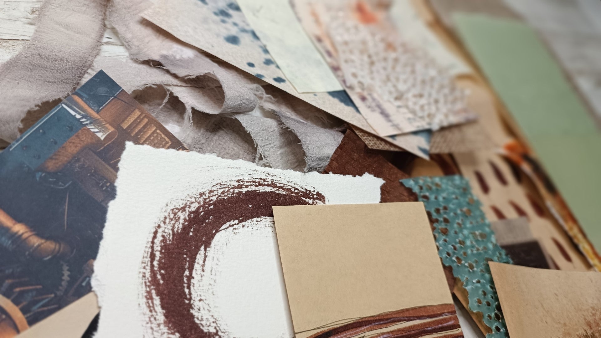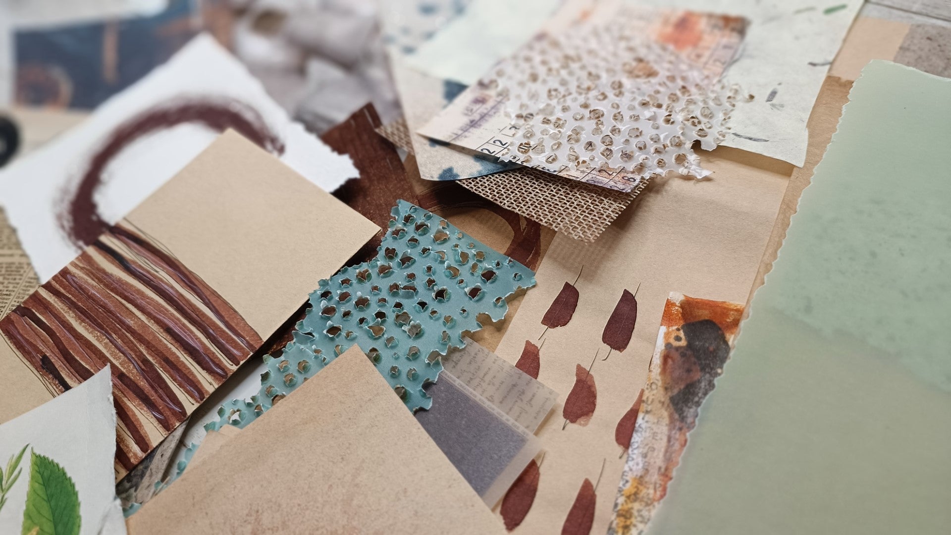 Curated collage bundle with around 40 different papers: 2 enveloppes with handmade mark making, 2 fabric pieces, vellum textured paper (yes, the one with burnt holes!), piece of my handmade washi tape, old book pages, cicada wings and mulberry paper, few handmade backgrounds of different sizes, one watercolor on the paper, and many, many more. I also add small surprise not seen on the video or photos, which includes a piece of blank washi tape ready to be personalised by you (the glossy side is covered with water-activated glue)