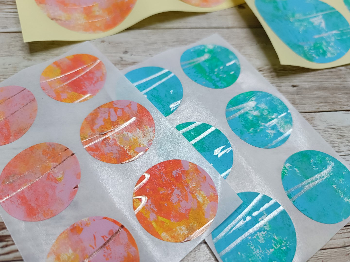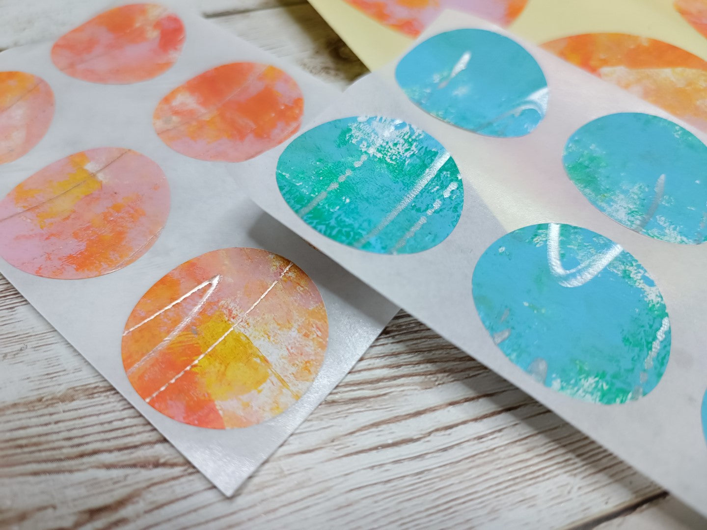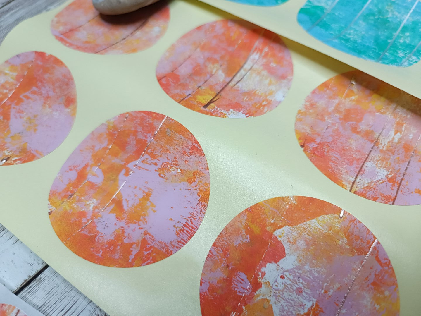 This is a set of handmade round stickers, gelli printed with acrylics (water resistant), with slight texture to them. Ideal for mixed media, scrapbooking and art journaling. They are already adhesive, but for better adherence I do advise you to add more glue.