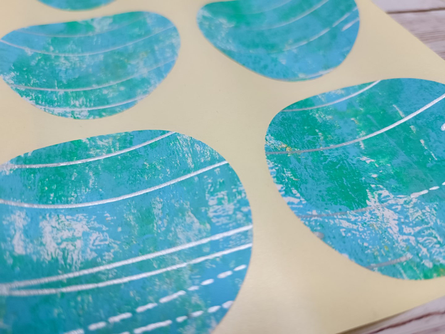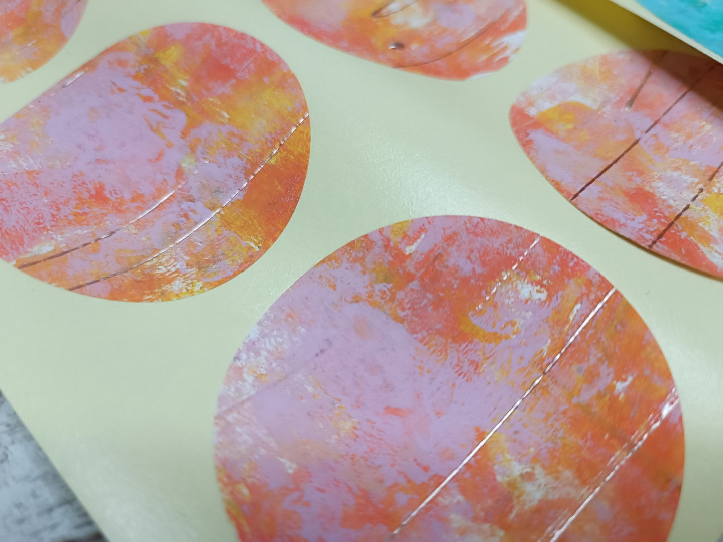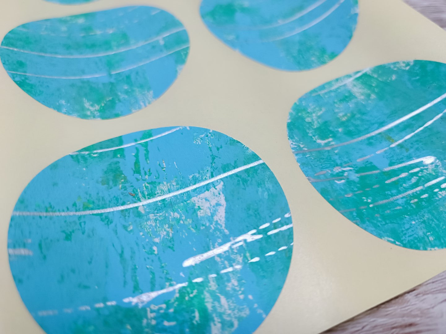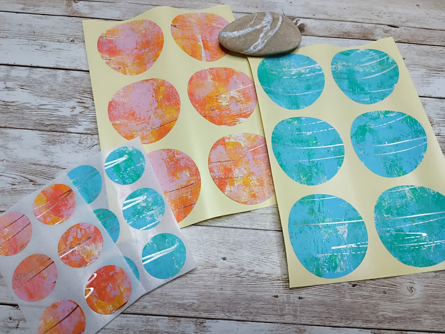This is a set of handmade round stickers, gelli printed with acrylics (water resistant), with slight texture to them. Ideal for mixed media, scrapbooking and art journaling. They are already adhesive, but for better adherence I do advise you to add more glue.