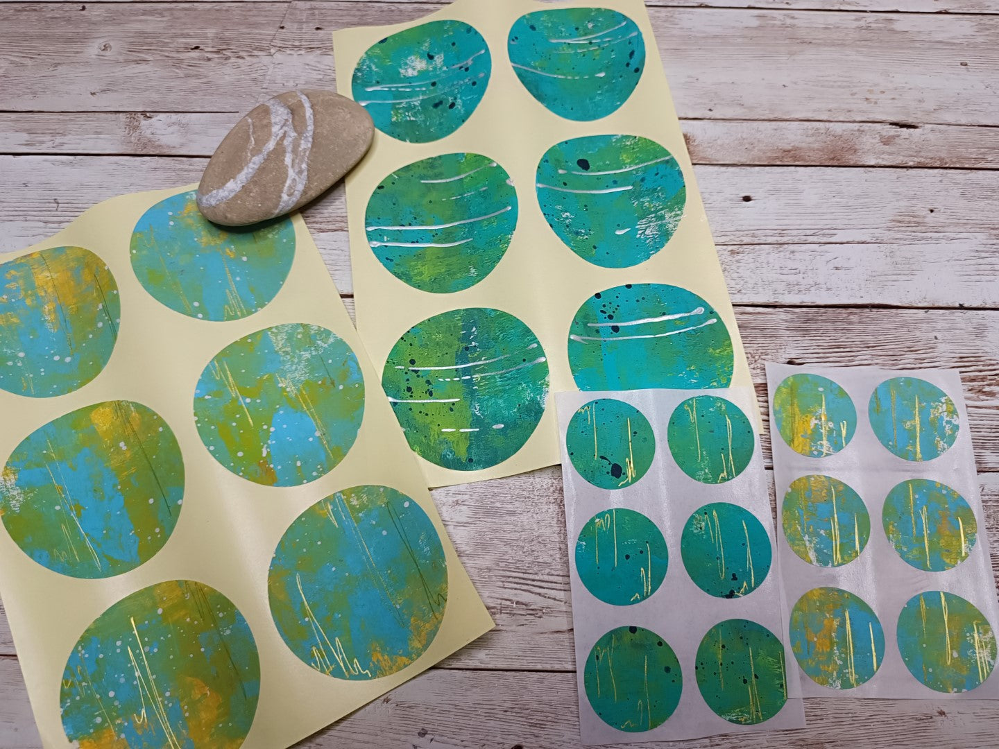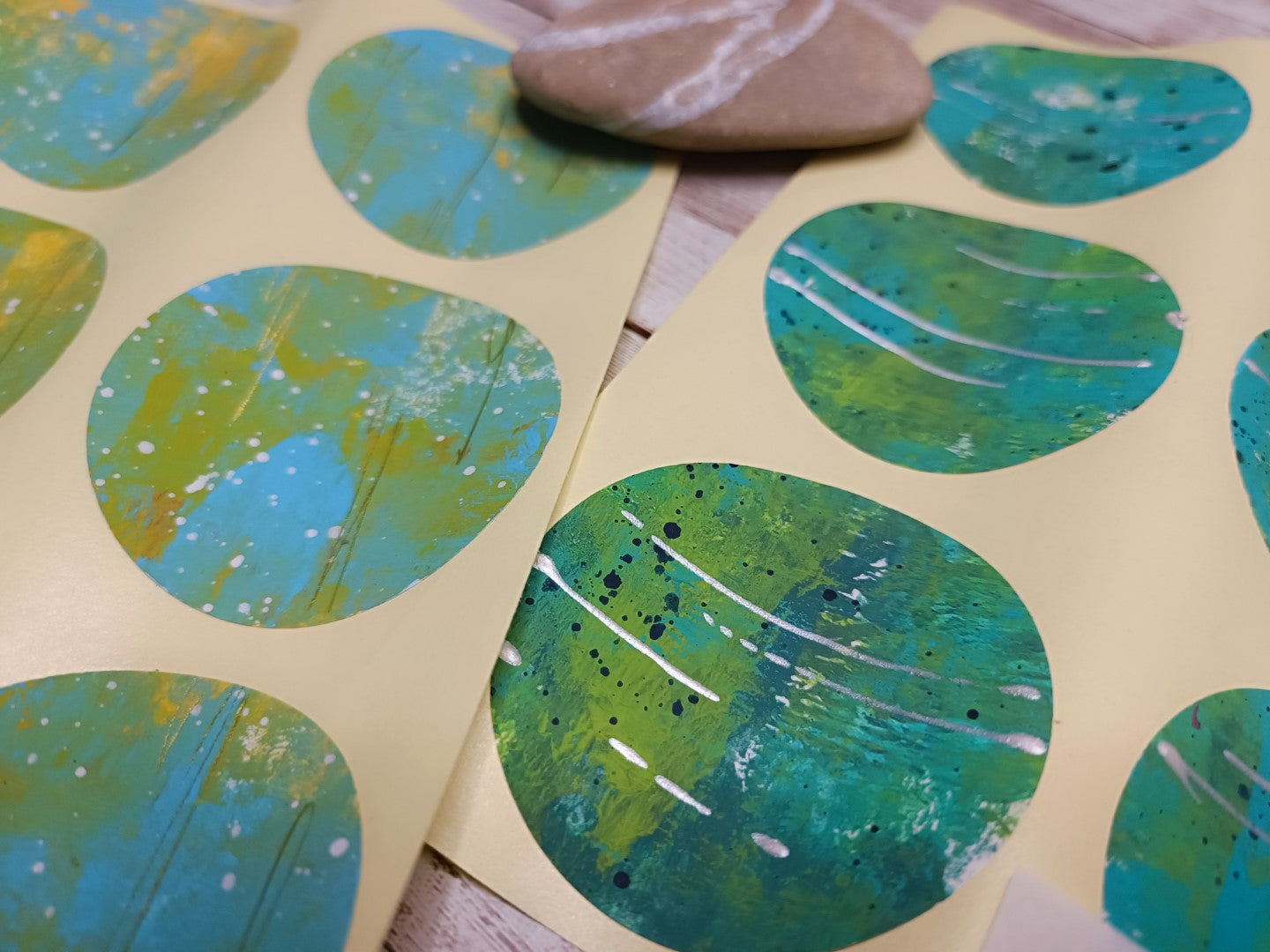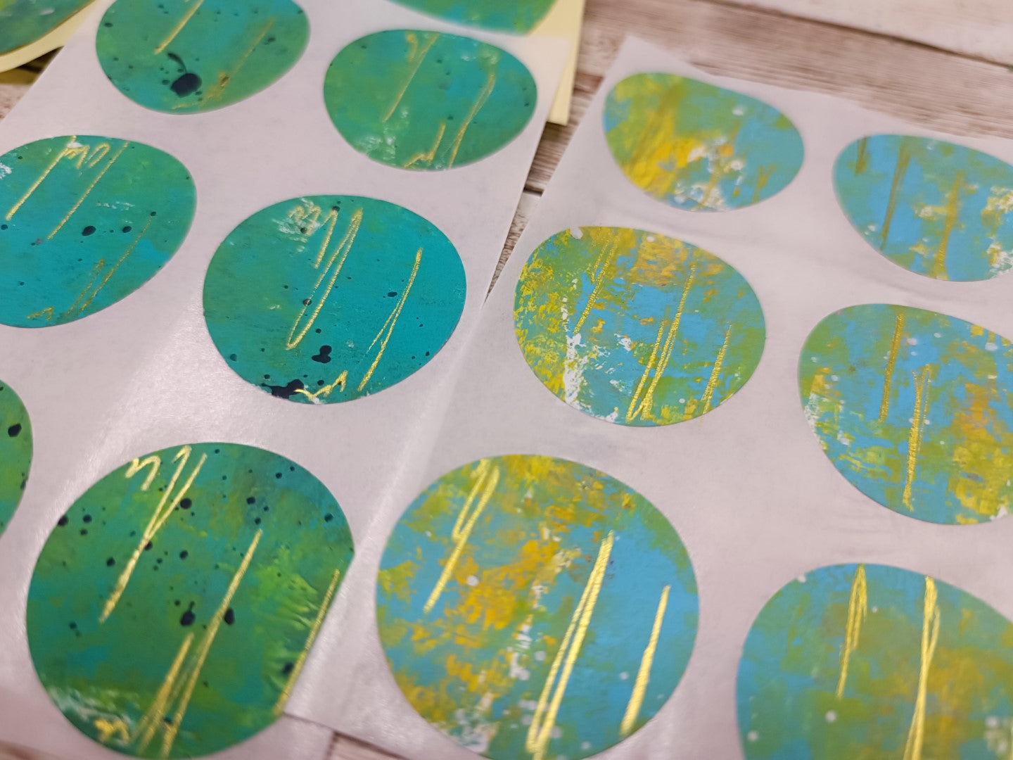 This is a set of handmade round stickers, gelli printed with acrylics (water resistant), with slight texture to them. Ideal for mixed media, scrapbooking and art journaling. They are already adhesive, but for better adherence I do advise you to add more glue.