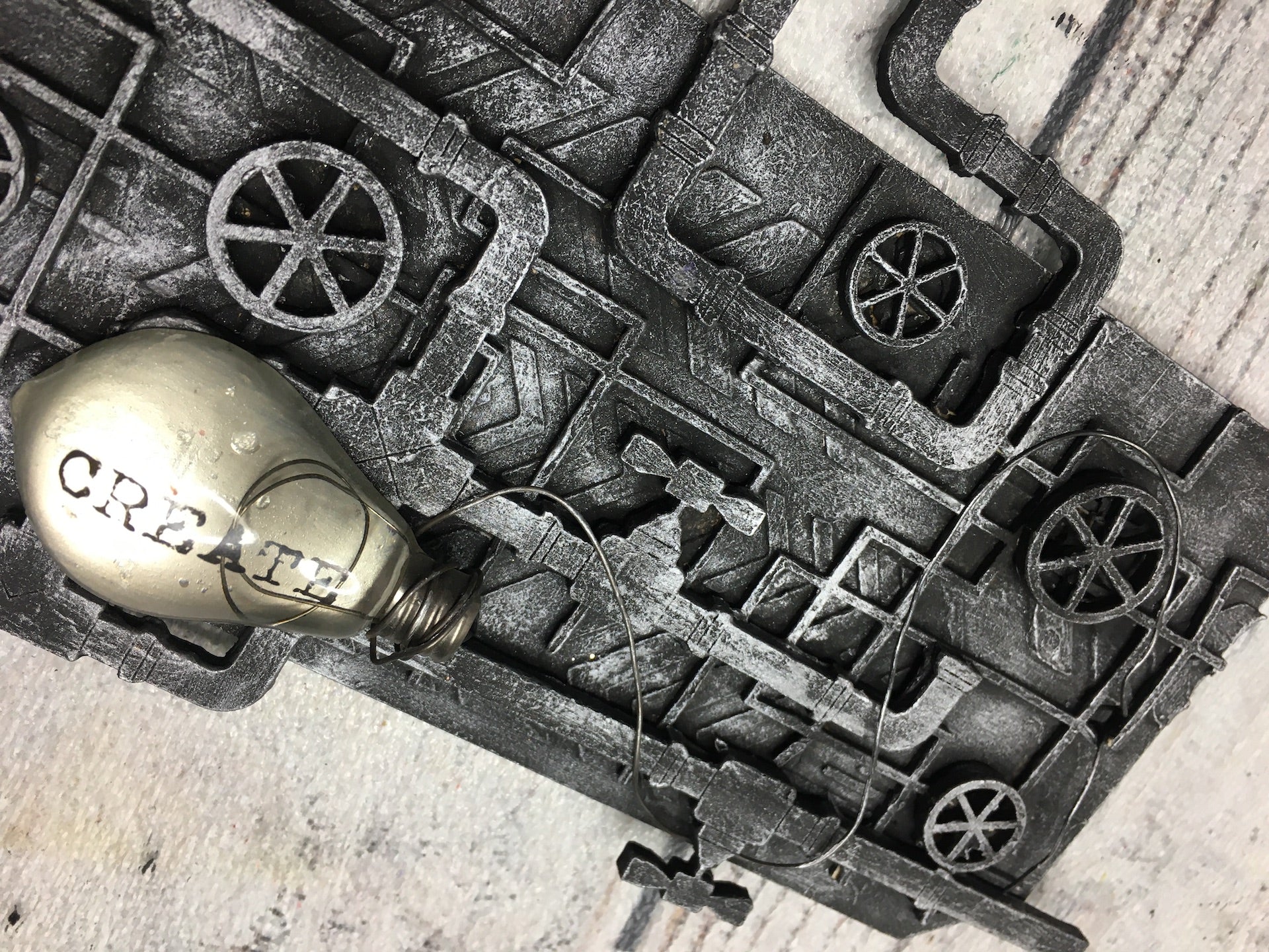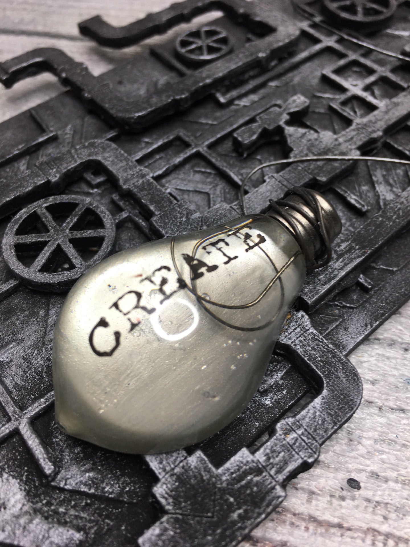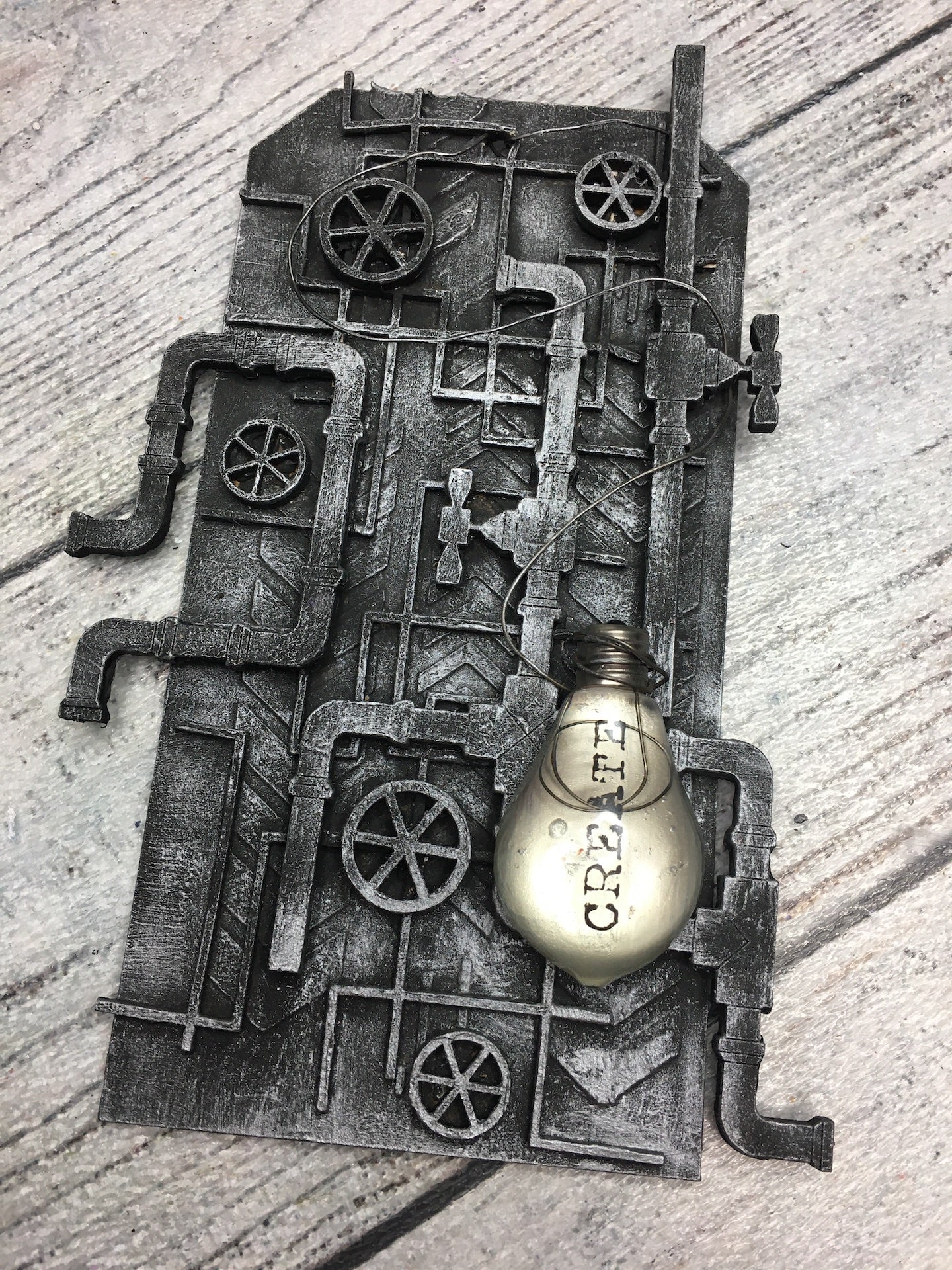 Steampunk tag with MDF elements and wire. Grey and silver.
